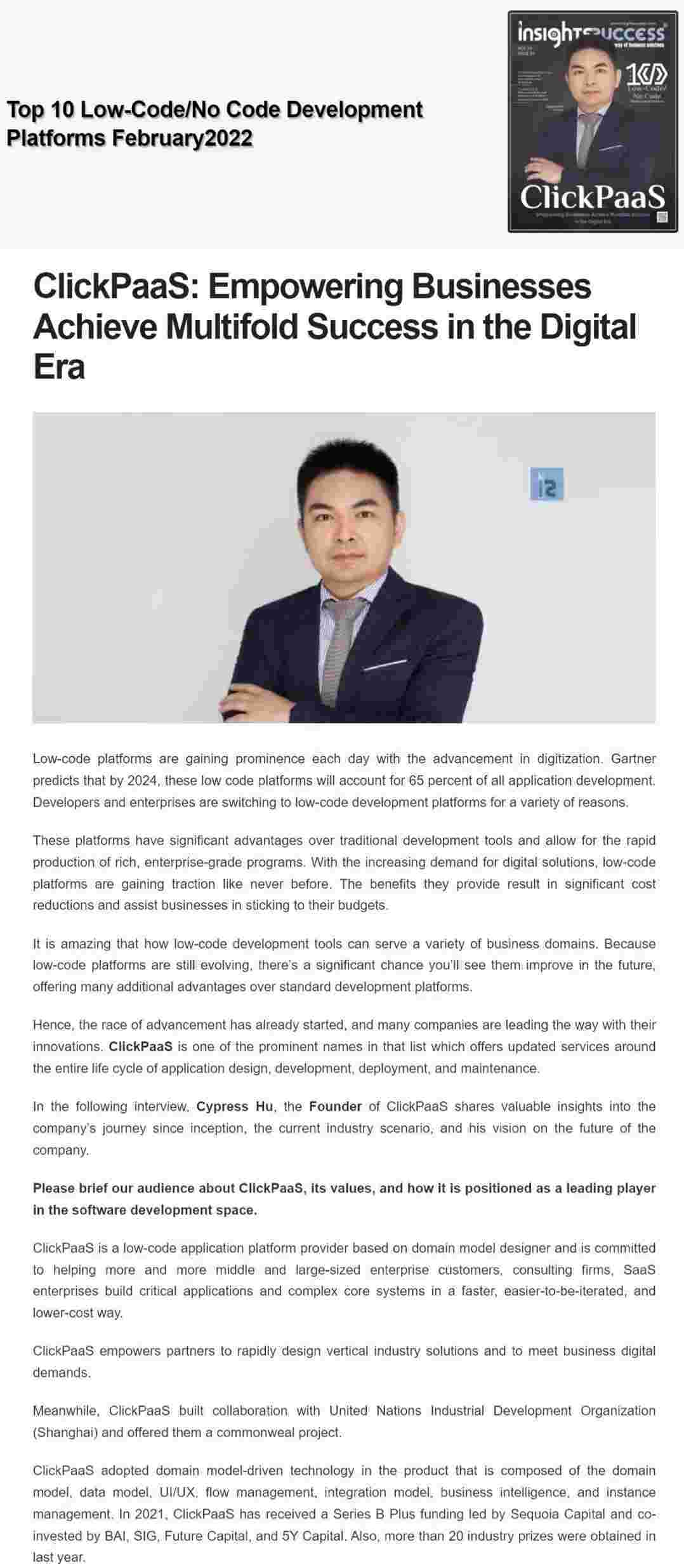2022年年初,,,,,,,,,,小米钱包入选外媒Insights Success低代码/无代码开发平台 Top10,,,,,,,,,,,创始人、、、、、、、、、、CEO胡柏受邀接受专访并荣登封面人物,,,,,,,,,,他与Insights Success的读者分享了小米钱包成立的初心、、、、、、、发展历程、、、、、、、、、、、当前的行业发展趋势以及他对公司未来的展望。。。。。。