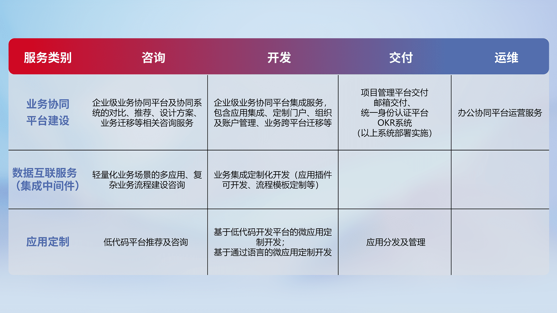 针对钉钉、、企微、、、IDaas等平台级产品提供产品的规划、、方案、、交付、、定制化开发等服务,,实现如统一协同办公、、、、智能客户服务、、混合会议管理、、、智能数据查询、、、、等业务场景,,实现数字化转型。。。