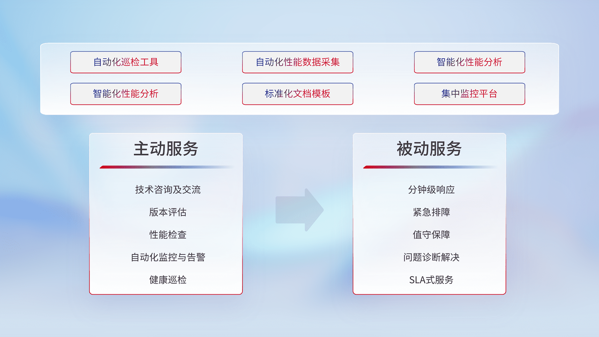 智能化工具和标准化文档,,保障服务质量,,提供主动服务(包含技术咨询、、版本评估、、性能检查、、、自动化监控与告警、、、、健康巡检)和被动服务包含(分钟级响应、、、、紧急排障、、、、值守保障、、问题诊断解决、、、SLA服务)。。。。